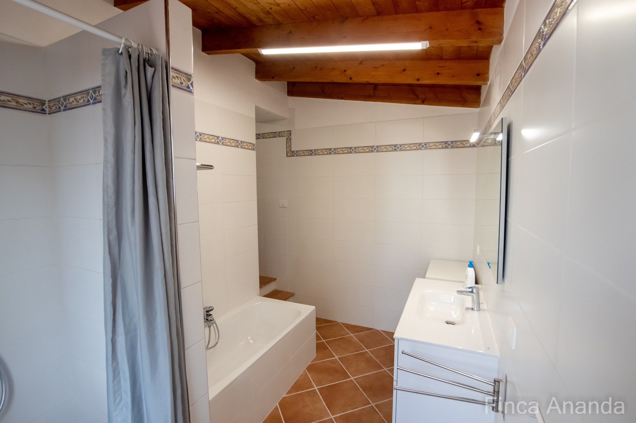 mit Dusche, großer Eckbadewanne, Waschbecken, WC, Waschmaschine, Fön und Handtücher. Es sorgt eine elektrische Schamottespeicherheizung in den Wintermonaten für Gemütlichkeit.