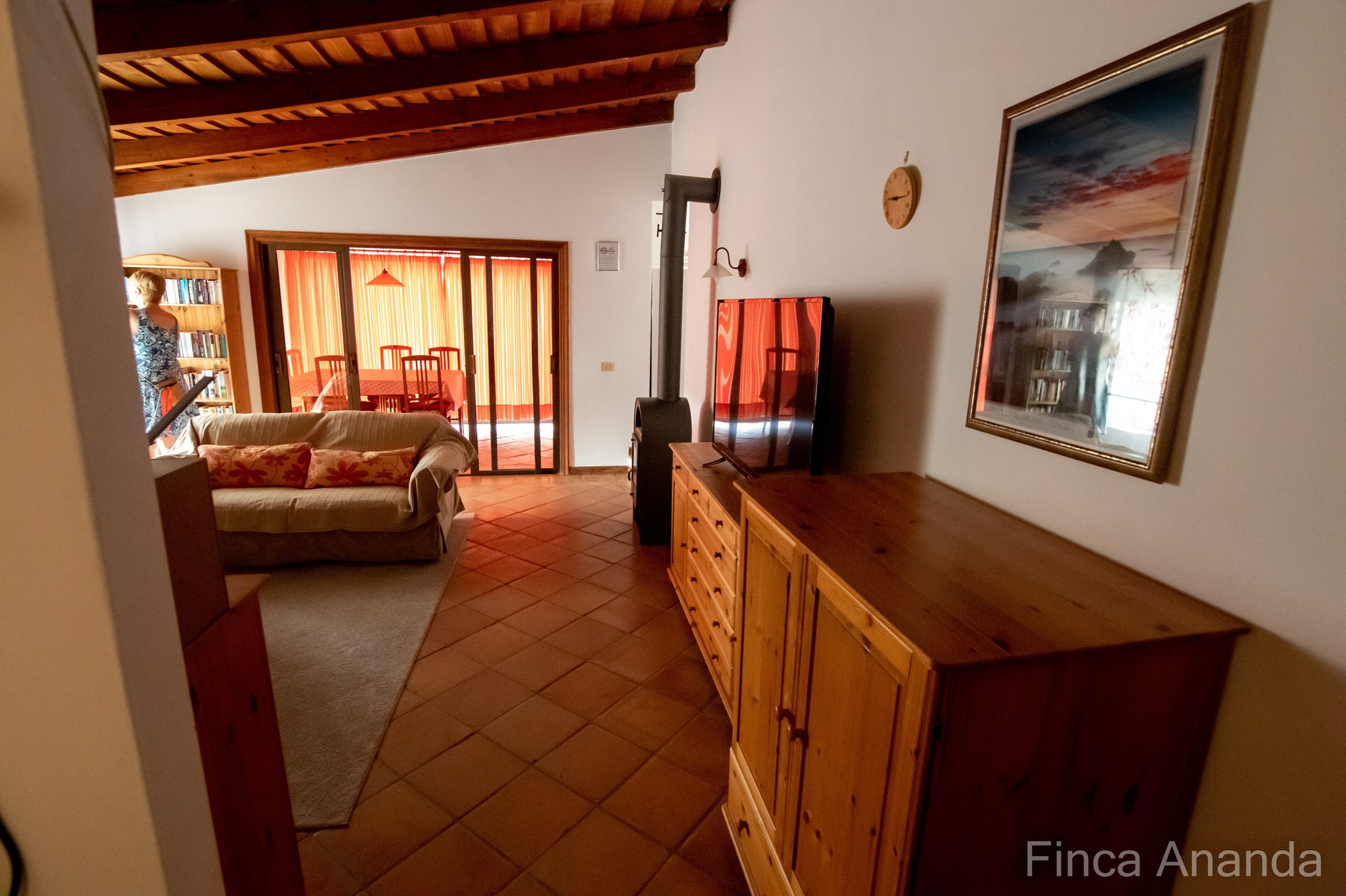 Im Haus erwartet Sie ein gemütliches Wohnzimmer mit bequemer Couchgarnitur, ein großer Fernseher mit Sat-Anschluss und deutsch-sprachigen Programmen, ein DVD-Player, sowie ein Radio mit CD. Von dort führen Glasschiebetüren durch das Sonnenzimmer auf die Süd-Terrasse hinaus, mit Blick aufs Meer.