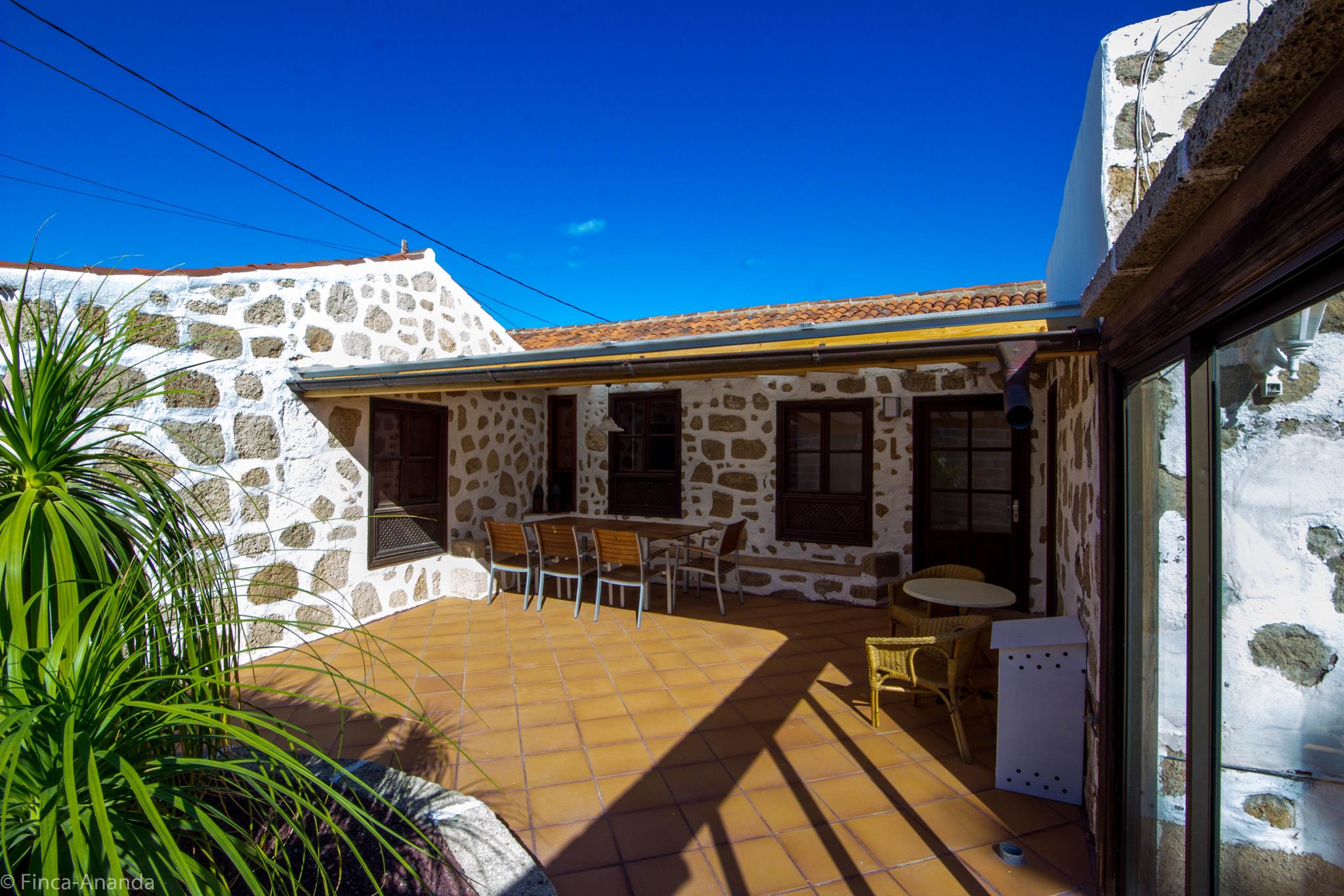 Tisch, Stühle, Bänke, Sonnenschirm und Liegestühle stehen Ihnen zur Verfügung. Von der Küche gelangen Sie in den windgeschützten, überdachten, kanarischen Patio.